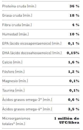 ENERGÍA METABOLIZABLE: 3850 kcal/kg, con 37 % de proteínas, 23 % de carbohidratos y 40 % de grasas.