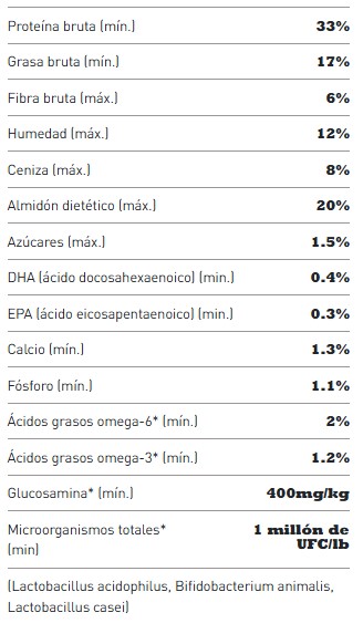 ENERGÍA METABOLIZABLE: 3440 kcal/kg (392 kcal por taza de 8 oz), con 34% de proteínas, 24% de carbohidratos y 42% de aceites de pescado ricamente nutritivos.