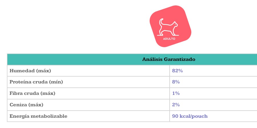 Agua suficiente para proceso, carne de salmón congelada, carne de pato congelada, pechuga de pollo congelada, hígado de pollo congelado, aceite de pollo, proteína hidrolizada de trigo, almidón de maíz, goma guar, proteína hidrolizada de pescado, extracto de levadura, taurina y cloruro de sodio.