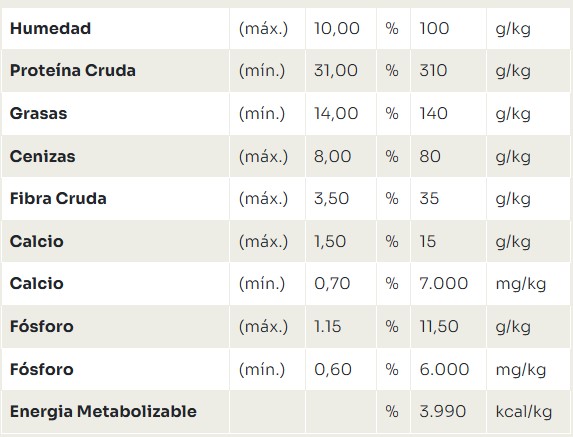 Harina de vísceras de pollo, harina de chicharrón de cerdo, gluten de maíz (no transgénico), proteína aislada de soja, arroz, complejo de vegetales – 5,0% (remolacha, brócoli, zanahoria, espinaca, pulpa de remolacha y perejil), grasa de cerdo, grasa de pollo, aceite de pescado, cloruro de potasio, cloruro de sodio, levadura de caña de azúcar, ácido cítrico, bentonita, antioxidantes (BHA, BHT), cloruro de amonio, pirofosfato trisódico, DL-metionina, extracto de Yucca schidigera (0,05%), hidrolizado dehígado de cerdo, pared celular de levadura (fuente de manano-oligosacáridos) (0,20%), taurina, sulfato de amonio, vitaminas (vitamina E, vitamina A, vitamina C, ácido fólico, ácido pantoténico, biotina, vitamina K3, vitamina B12, cloruro de colina, vitamina D3, niacina, piridoxina, riboflavina,(tiamina), minerales (quelato de aminoácido de hierro, yodato de calcio, quelato de aminoácido de manganeso, selenometionina, sulfato de cobre, sulfato de hierro, sulfato de manganeso, sulfato de zinc, quelato de aminoácido de zinc).