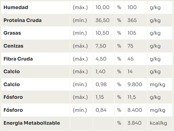 Harina de vísceras de pollo, harina de chicharrón de cerdo, gluten de maíz (no transgénico), proteína aislada de soja, harina de yuca, arroz, complejo de vegetales – 6,8%(calabaza, romero, remolacha, zanahoria, espinaca, pulpa de remolacha y perejil), grasade pollo, aceite de pescado, cloruro de potasio, cloruro de sodio, levadura de caña de azúcar, ácido cítrico, bentonita, antioxidantes (BHA, BHT), cloruro de amonio, pirofosfato trisódico, DLmetionina, extracto de Yucca schidigera (0,05%), hidrolizado de hígado de cerdo, Lcarnitina, taurina, sulfato de amonio, vitaminas (vitamina E, vitamina A, vitaminaC, ácido fólico, ácido pantoténico, biotina, vitamina K3, vitamina B12, cloruro de colina, vitamina D3, niacina, piridoxina, riboflavina, tiamina), minerales (quelato de aminoácido de hierro, yodato de calcio, quelato de aminoácido de manganeso, selenometionina, sulfatode cobre, sulfato de hierro, sulfato de manganeso, sulfato de zinc, quelato de aminoácido de zinc).