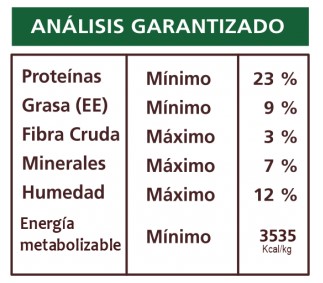 Maíz, harina de carne (no rendering), harina de carne de ave (no rendering), harinilla de arroz, arroz, aceite de pollo estabilizado, algas marinas(fuente de omega 3 y 6), hidrolizado de hígado de bovino, cultivo de levaduras, glucosamina y sulfato de condroitina, vitaminas(A, D3, E, B1, B6, B2, B12, cloruro de colina, niacina, ácido fólico, biotina), minerales(Calcio, Fósforo, Hierro, Manganeso, Yodo, Selenio, Cobalto, Cobre, Zinc, Magnesio y Potasio), desodorizante natural autorizado (Extracto de Yucca y Zeolitas), Preservantes y antioxidantes autorizados.