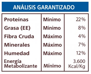 Maíz, harina de carne, harina de carne de ave, harinilla de arroz, arroz, aceite de pollo estabilizado, RationPlus® (algas marinas (fuente de omega 3 y 6), hidrolizado de hígado bovino, cultivo de levaduras, vitaminas (A, D3,E,B1,B2, B12), cloruro de colina, niacina, ácido fólico, biotina, minerales (Hierro, Manganeso, yodo, selenio, cobalto, cobre, zinc, magnesio y potasio), Desodorizante natural autorizado (extracto de yucca y zeolitas), preservantes y antioxidantes autorizados.