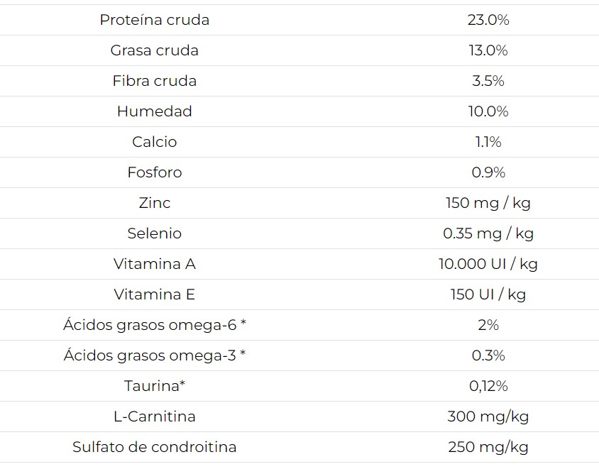 Pollo, harina de pollo, arroz integral integral, cebada perlada partida, arroz blanco molido, salvado de arroz, sorgo en grano, levadura seca, grasa de pollo (conservada con una mezcla de tocoferoles), producto de huevo, pulpa de remolacha seca, saborizante natural, linaza, cloruro de potasio , sal, DL-metionina, cloruro de colina, taurina, clorhidrato de glucosamina, raíz de achicoria seca, L-carnitina, col rizada, semilla de chía, calabaza, arándanos, naranjas, quinua, algas secas, coco, espinacas, zanahorias, papaya, extracto de yuca schidigera , producto de fermentación de Lactobacillus plantarum seco, producto de fermentación de Bacillus subtilis seco, producto de fermentación de Lactobacillus acidophilus seco, producto de fermentación de Enterococcus faecium seco, producto de fermentación de Bifidobacterium animalis seco, suplemento de vitamina E, betacaroteno, sulfato de condroitina, proteinato de hierro, proteinato de zinc, proteinato de cobre,sulfato ferroso, sulfato de zinc, sulfato de manganeso, sulfato de cobre, yoduro de potasio, mononitrato de tiamina, proteinato de manganeso, ácido ascórbico, suplemento de vitamina A, biotina, niacina, pantotenato de calcio, selenito de sodio, clorhidrato de piridoxina, suplemento de vitamina B12, riboflavina, suplemento de vitamina D3 , ácido fólico.