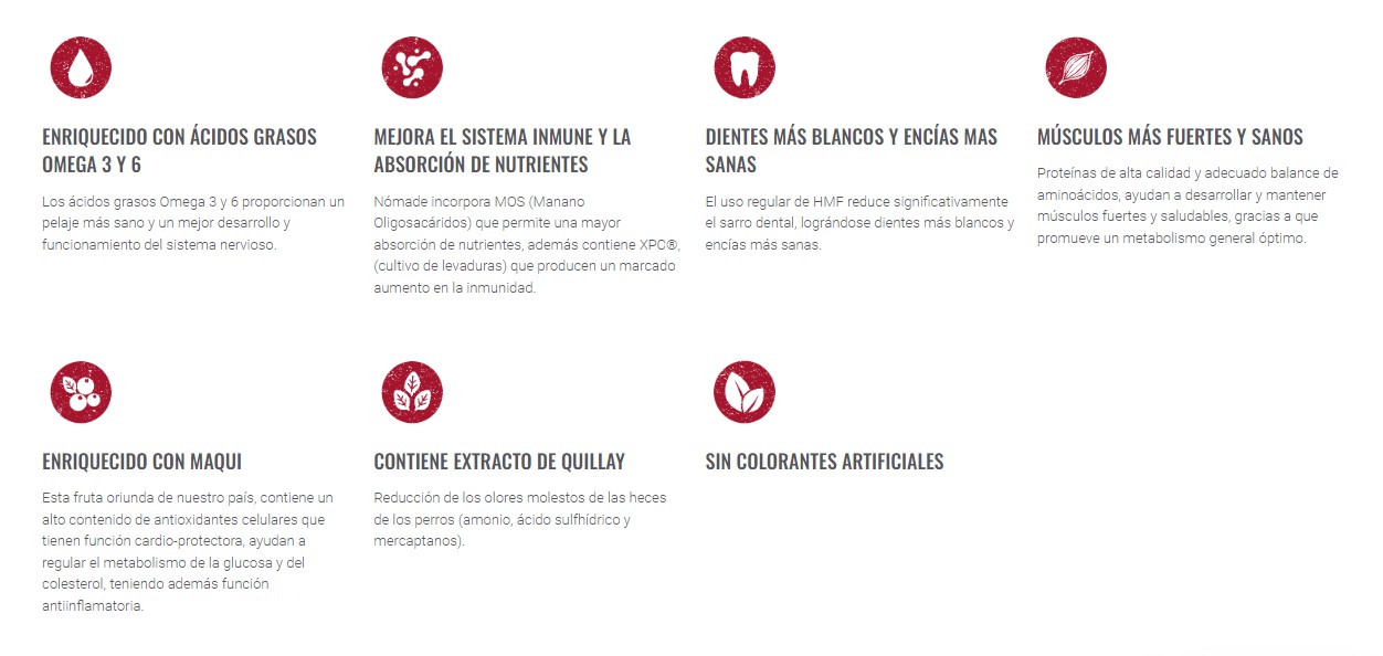 Harina de ave y/o vacuno; Maíz; Arroz; Subproductos de trigo; Aceite de ave y/o cerdo; Harina de soya; Hidrolizado de hígado de ave/vacuno; Carbonato de calcio; Colorante caramelo natural; Sal; Cultivo de levaduras XPC (Diamond V Mills); Aceite de salmón (como fuente de Omega 3, EPA y DHA); Maqui orgánico deshidratado; Hexametafosfato de sodio (HMF); Extracto Yucca-Quillay; Zinc orgánico; Manano Oligosacáridos (MOS); Antioxidantes autorizados y esencia de carne. Vitaminas: A, B1, B2, B6, D3, Niacina, Cloruro de Colina, Pantotenato de calcio y Ácido fólico. Minerales: Calcio, Fósforo, Hierro, Zinc, Cobre, Manganeso, Sodio y Selenio.