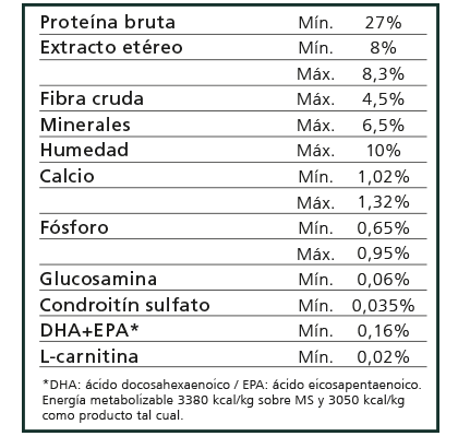 Condroitín sulfato y glucosamina que ayudan a proteger las articulaciones en perros con sobrepeso o tendencia al mismo.