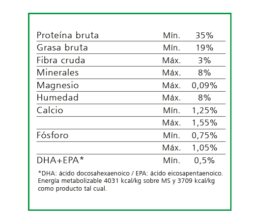 Harina de pavo, arroz, hidrolizado de hígado porcino deshidratado, aceite de pollo, huevo en polvo, cebada, arvejas secas, avena, pulpa de remolacha, coco deshidratado, aceite de pescado, aceite de coco, zapallo deshidratado, semillas de chía, sal, taurina, probióticos, extracto de manzanilla, jengibre en polvo, hinojo, extracto de romero, arándanos liofilizados (blueberries), arándanos rojos (cranberries), extractos vegetales naturales (té verde), aceite de raya, fructooligosacáridos. Vitaminas: A, C, D3, E, B1, B2, B6, B12, biotina, ácido fólico, niacina, ácido pantoténico, cloruro de colina. Minerales: hierro, cobre, zinc, selenio, manganeso, yodo, calcio.