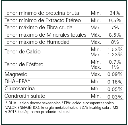 Harina de pavo, hidrolizado de hígado porcino deshidratado, arroz, arroz integral, celulosa en polvo, cebada, arvejas secas, pulpa de remolacha, Vitacel Psyllium, avena, aceite de pollo, coco deshidratado, aceite de pescado, zapallo deshidratado, semillas de chía, tomate deshidratado en polvo, aceite de coco, sal, taurina, probióticos, arándanos rojos (cranberries), extracto de manzanilla, jengibre en polvo, hinojo, extracto de romero, menta molida, arándanos liofilizados (blueberries), extractos vegetales naturales (té verde), aceite de raya, glucosamina, condroitín sulfato, L-carnitina, fructooligosacáridos, hexametafosfato de sodio. Vitaminas: A, C, D3, E, B1, B2, B6, B12, biotina, ácido fólico, niacina, ácido pantoténico, cloruro de colina. Minerales: hierro, cobre, zinc, selenio, manganeso, yodo, calcio.