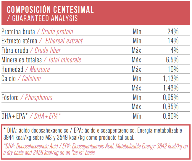 Harina de pavo, arroz, arroz integral, arvejas secas, avena, aceite de girasol, aceite de pollo, aceite de pescado, pulpa de remolacha, zapallo deshidratado, coco deshidratado, hidrolizado de hígado porcino deshidratado, aceite de coco, semillas de chía, aceite de raya, probióticos (Saccharomyces cerevisiae, Enterococcus faecium, Lactobacillus acidophilus), extracto de manzanilla, jengibre en polvo, hinojo, extracto de romero, arándanos liofilizados (blueberries), extractos vegetales naturales (té verde), fructooligosacáridos, hexametafosfato de sodio. Vitaminas: A, C, D3, E, B1, B2, B6, B12, ácido fólico, niacina, ácido pantoténico, cloruro de colina. Minerales: hierro, cobre, zinc, selenio, manganeso, yodo, calcio.