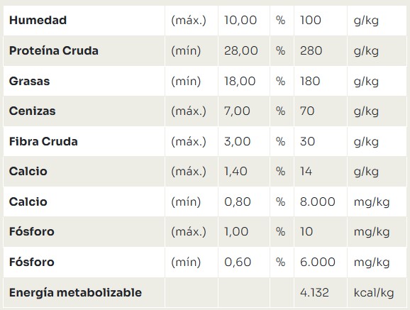 Harina de vísceras de pollo, harina de salmón, gluten de maíz (no transgénico), huevo en polvo, arroz, pulpa de remolacha, grasa de cerdo, grasa de pollo, aceite de pescado, cloruro de potasio, cloruro de sodio, levadura de caña de azúcar, ácido propiónico, bentonita, antioxidantes (BHA, BHT), extracto de Yucca schidigera (0,06%), hexametafosfato de sodio, hidrolizado de hígado de aves y cerdo, manano-oligosacáridos (0,20%), vitaminas (vitamina E, vitamina A, vitamina C, ácido fólico, ácido pantoténico, biotina, vitamina K3, vitamina B12, cloruro de colina, vitamina D3, niacina, piridoxina, riboflavina, tiamina), minerales (quelato de aminoácido de hierro, yodato de calcio, quelato de aminoácido de manganeso, selenometionina, sulfato de cobre, sulfato de hierro, sulfato de manganeso, sulfato de zinc, quelato de aminoácido de zinc).