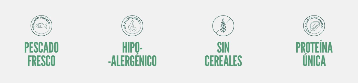 Salmón fresco (30%), harina de salmón (25%), patata deshidratada (14%), hidrolizado de salmón (5%), aceite de salmón, proteína de patata, levadura (4%), pulpa de remolacha, harina de algarroba, fibra vegetal, sustancias minerales, inulina (FOS 1.000 mg/kg), manano-oligosacáridos (MOS 1.000 mg/kg), Yucca schidigera, extracto de cítricos.
