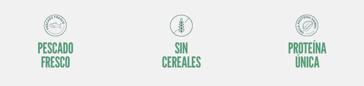 Salmón fresco (40%), harina de salmón (25%), patata deshidratada (20%), proteína de patata, aceite de salmón, hidrolizado de salmón (5%), levadura, pulpa de remolacha, cloruro sódico, polifosfatos sódicos (0,3%), cloruro potásico, inulina (FOS 1.000 mg/kg), jengibre, manano-oligosacáridos (MOS 260 mg/kg), Yucca Schidigera.