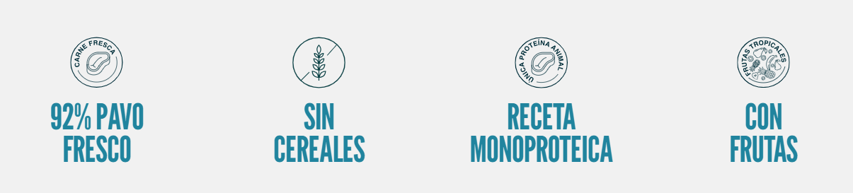 Pavo (carne) (92%), frambuesas (2%), pera (2%), romero, sustancias minerales, xilosa.