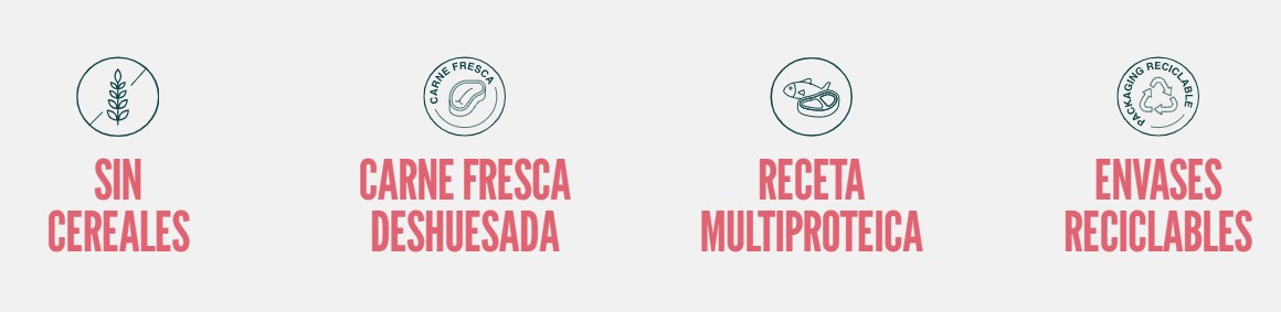 Pollo fresco deshuesado (20%), proteína de salmón deshidratada, patata (19%), pescado (17%), legumbres (12%), grasa de ave, levadura, hígado de pollo hidrolizado, aceite de salmón, complejo vegetal -achicoria, zanahorias (1%), judías verdes (0,7%)-, minerales, lignocelulosa, manzana (1%), glucosamina, sulfato de condroitina, prebióticos: fructooligosacáridos -FOS-, mananooligosacáridos -MOS-, plantas herbáceas -caléndula (0,2%), romero (0,01%), espirulina, salvia, tomillo, eneldo-, extractos de plantas -bayas rojas (0,005%), diente de león, semillas de té verde, Aloe vera, hojas de menta (0,005%), cítricos (0,005%)-, Yucca schidigera.