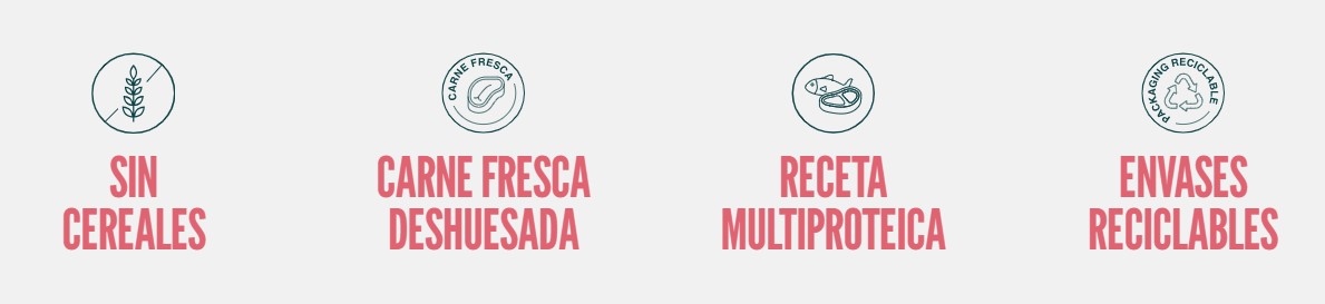 Pollo fresco deshuesado (20%), proteína de pollo deshidratada, patata (19%), legumbres (15%), grasa de pollo, levadura, proteína de pescado deshidratada, hígado de pollo hidrolizado, aceite de salmón, complejo vegetal -achicoria, zanahorias (1%), judías verdes (0,5%)-, minerales, manzana, glucosamina, sulfato de condroitina, prebióticos: mananoligosacáridos -MOS-, fructooligosacáridos -FOS-, plantas herbáceas -caléndula (0,2%), romero (0,01%), espirulina, salvia, tomillo, eneldo- extractos de plantas -bayas rojas (0,005%), hojas de menta (0. 005%), cítricos (0,005%)-, Yucca schidigera.