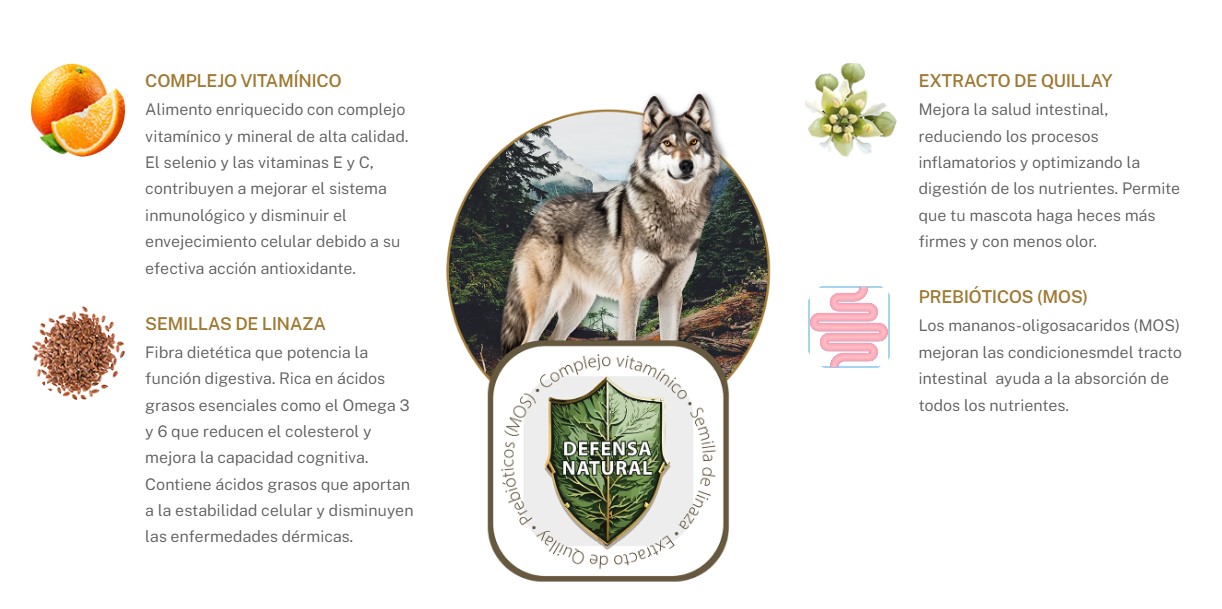 Harina de Carne y/o pollo, Carne fresca de pollo, Maíz, Sub productos de trigo, Arroz, Aceite de pollo, Hidrolizado de hígado de pollo y/o vacuno, Premix vitamínico y mineral. Vitaminas (U.I),A, D3,E, Vitaminas (mg/kg) C, Ácido Pantoténico B5, Piridoxina B6, Riboflavina B2, Niacina B3, Tiamina B1, Biotina B7, Cobalamina B12, AC, Fólico B9. Minerales Zinc, Hierro, Cobre, Yodo, Selenio. Aminoácidos, L- Metionina. Zeolita, Cloruro de colina, Extracto de quillay, sal, semillas de linaza (fuente de Omega 6), Levadura de cerveza, DHA (fuente de omega 3), Manano Oligosacáridos (MOS), Extraccto de yucca Schidigera, Fosfato Bicálcico, Antifúngicos y preservantes, Antioxidantes naturales.